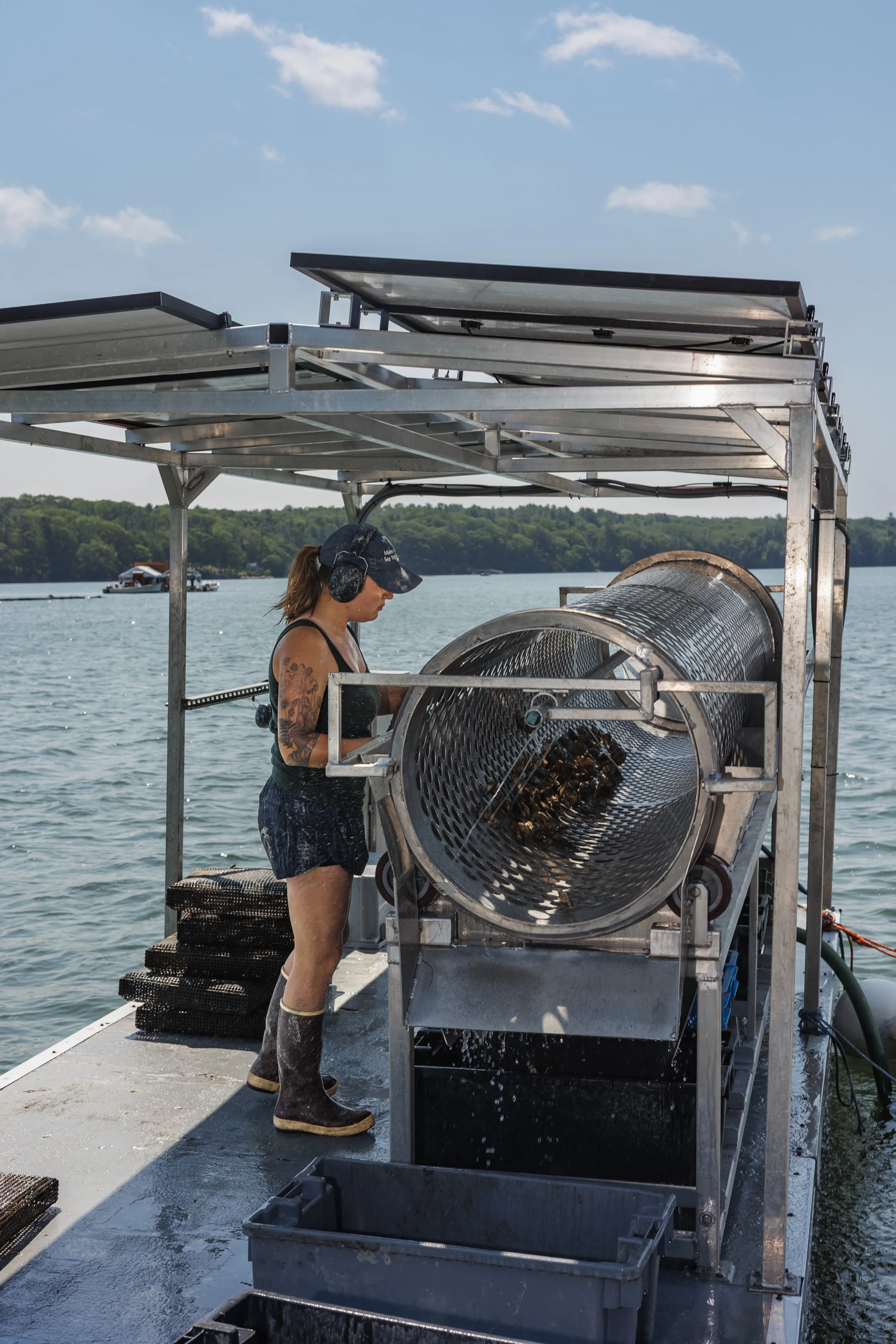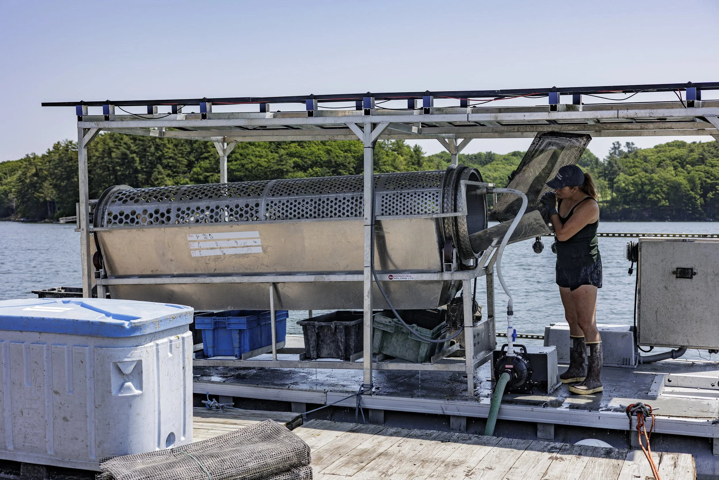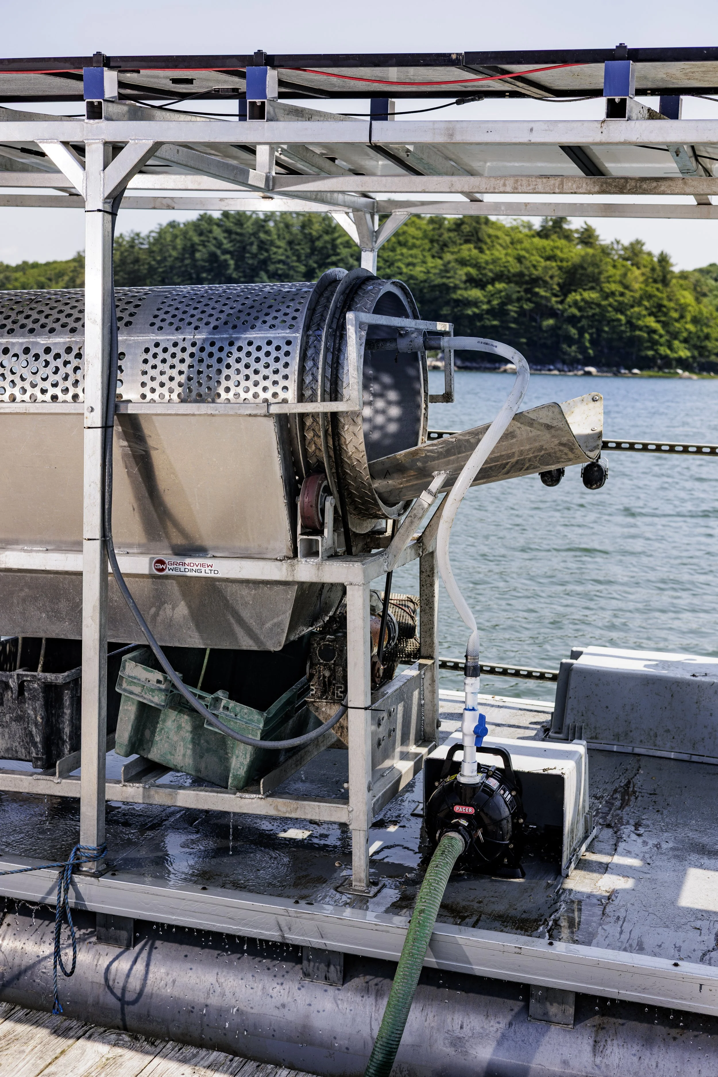 The solar array and battery system power the tumbler, winch, and washdown pump. One significant benefit of a solar-powered tumbler is that it’s much quieter than one powered by a generator. Not only does this make the work more pleasant, but it also helps prevent hearing damage from long days tumbling out on the water. An electric winch is critical to their operations. The winch is used during harvesting to lift cages or bags out of the water.