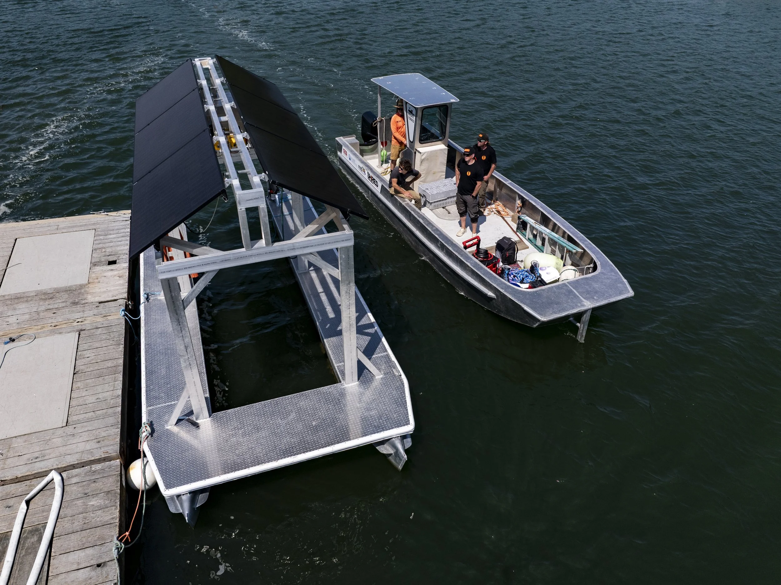 The solar barge is a 26 x 8-foot aluminum flat workspace on top of a metal catamaran hull. The barge’s flat deck provides lots of working space and room for equipment. The catamaran hull provides a stable base for the work platform while enabling the barge to motor through the water when necessary.